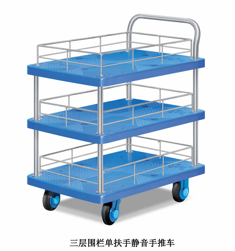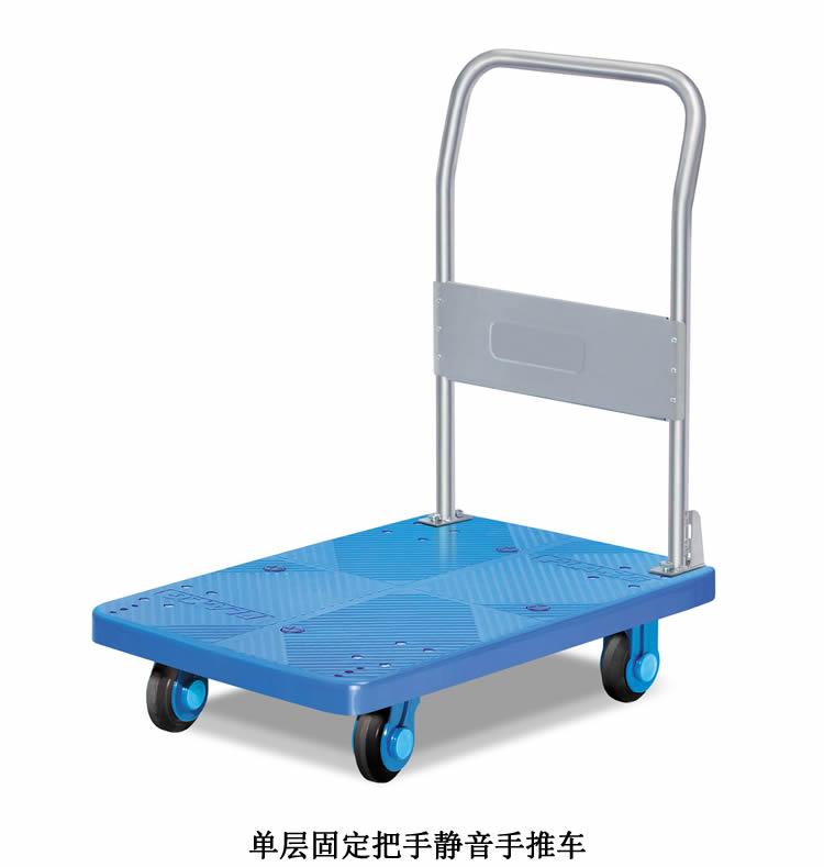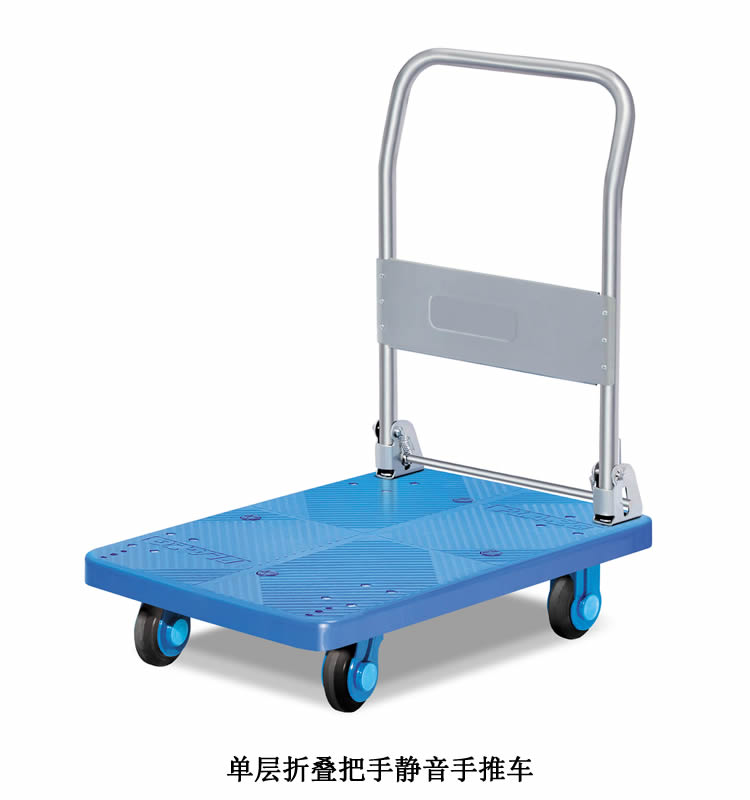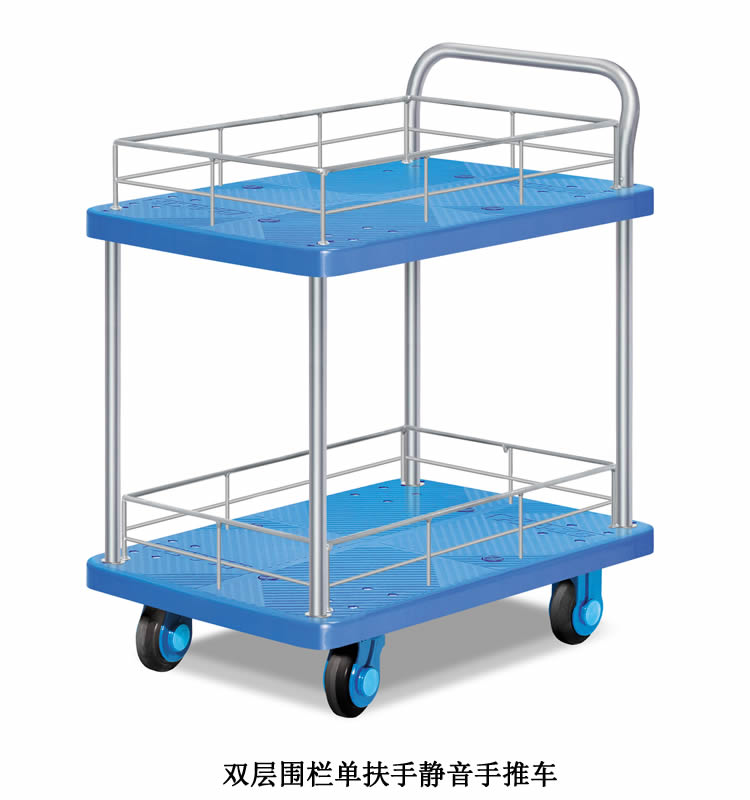 靜音手推車由塑料車板、扶手(可折倒、固定)、靜音腳輪(尼龍支架、鐵板支架)等組成。